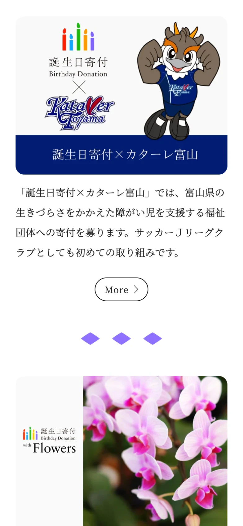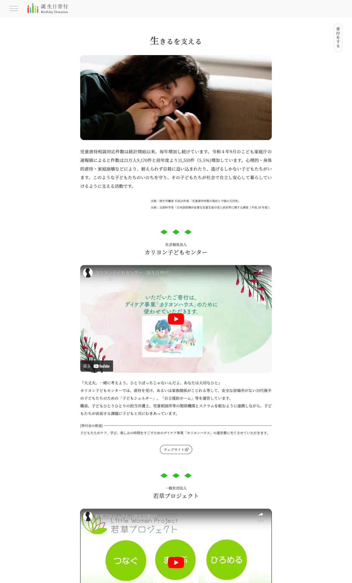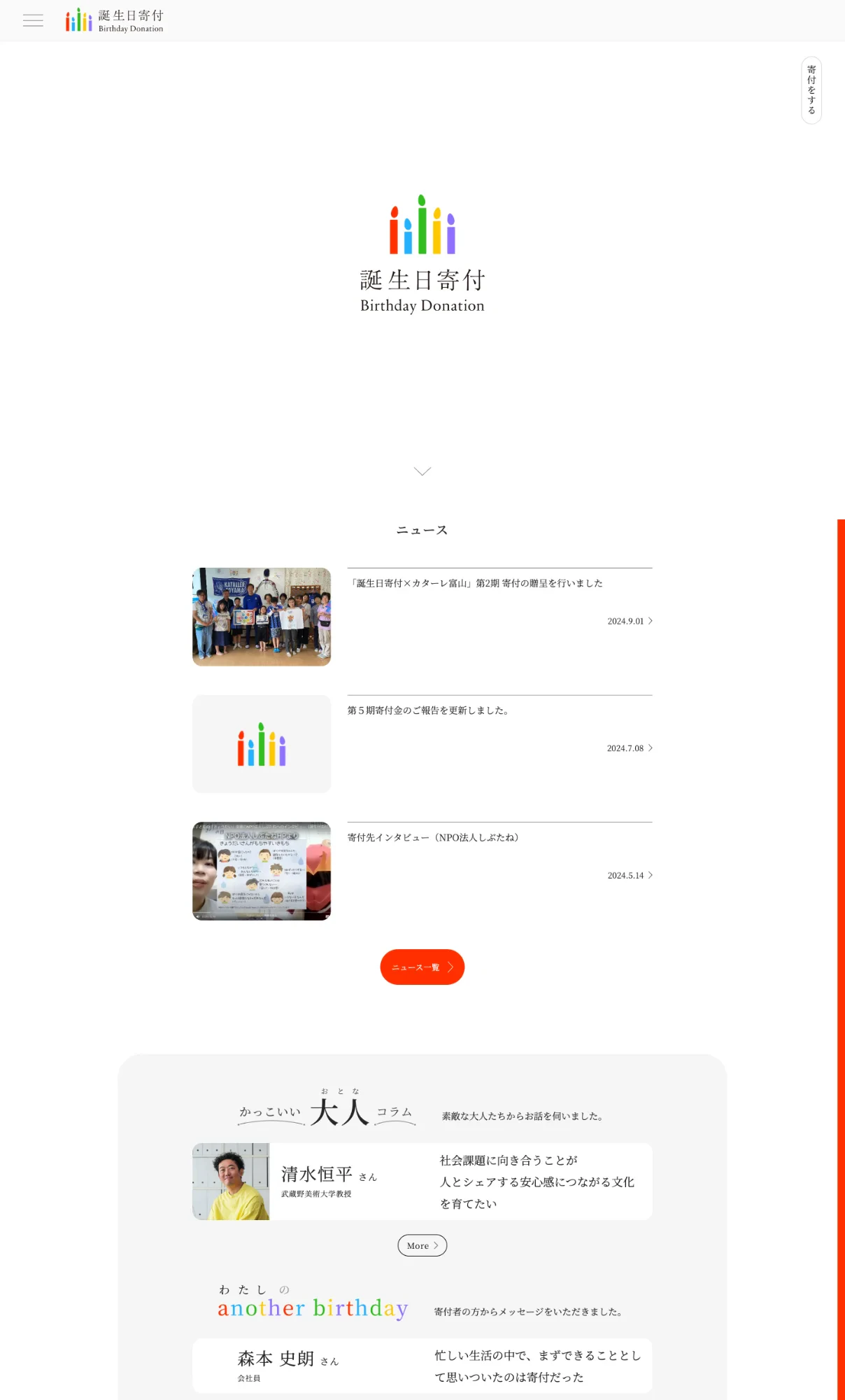 誕生日寄付 プロモーションサイト リリース 2024.01 役割 Coding 採用技術 WordPress, HTML, CSS, SCSS, JavaScript, webpack, GIt, Docker Coding 寄付サイトの特性を考慮し、穏やかな印象を与えるスムースなアニメーションを実装することで、ユーザーに安心感のあるインターフェースを実現しました。 URL https://www.birthday-donation.jp