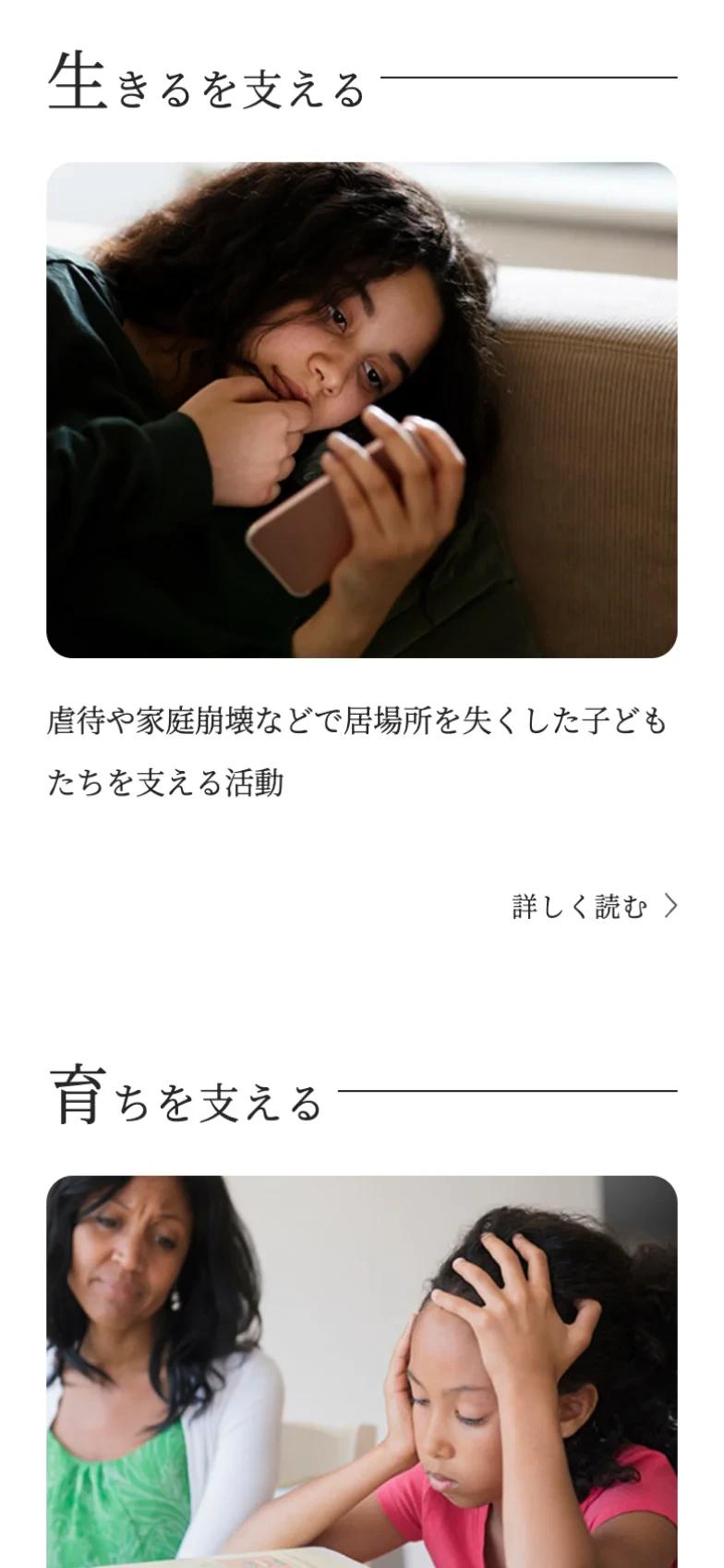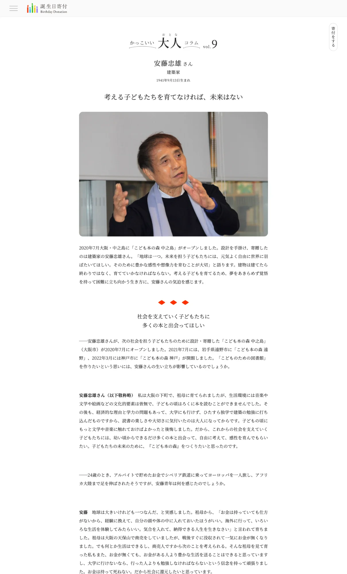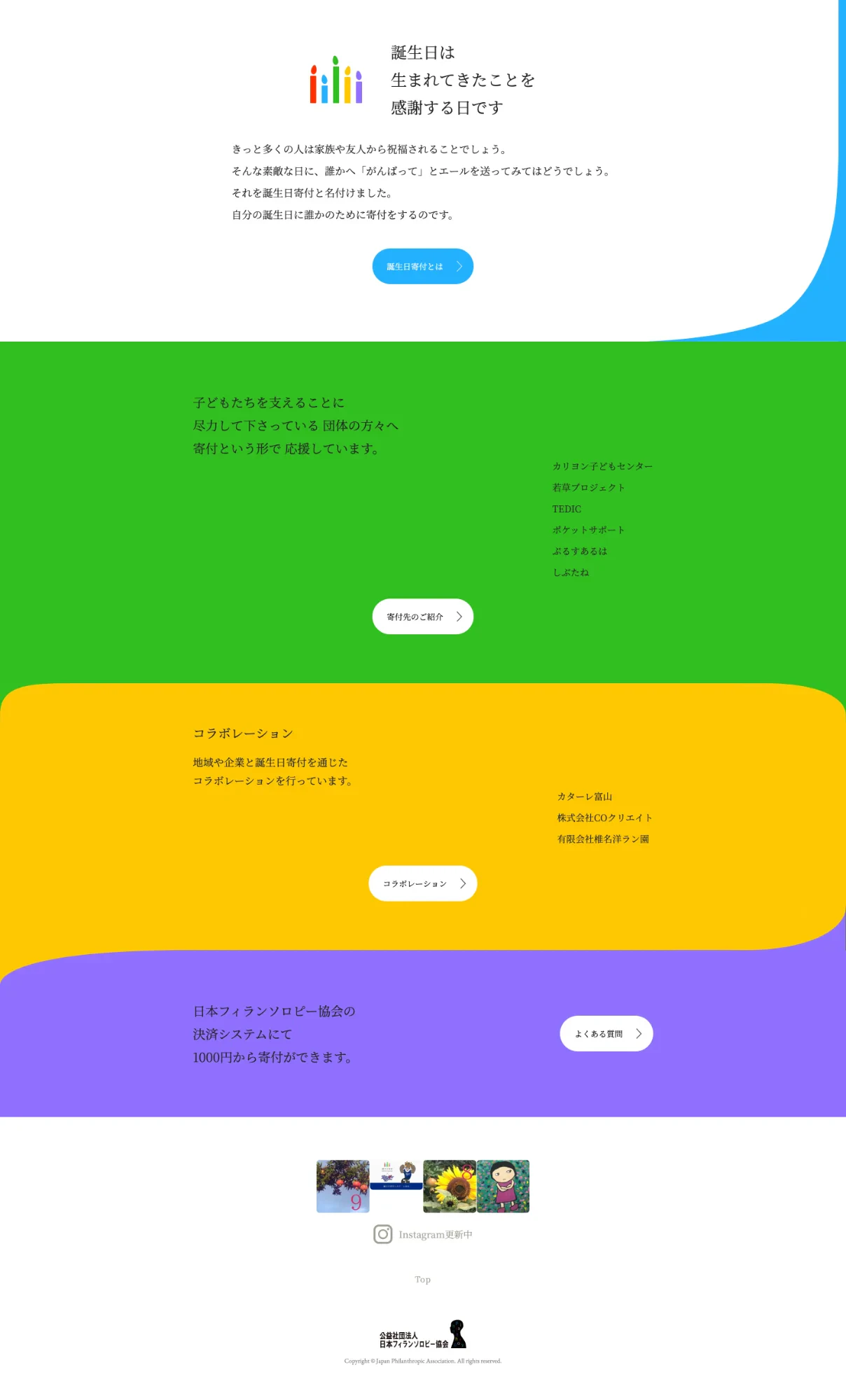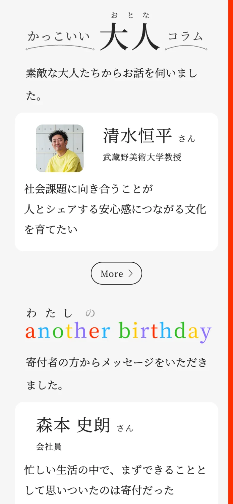 誕生日寄付 プロモーションサイト リリース 2024.01 役割 Coding 採用技術 WordPress, HTML, CSS, SCSS, JavaScript, webpack, GIt, Docker Coding 寄付サイトの特性を考慮し、穏やかな印象を与えるスムースなアニメーションを実装することで、ユーザーに安心感のあるインターフェースを実現しました。 URL https://www.birthday-donation.jp